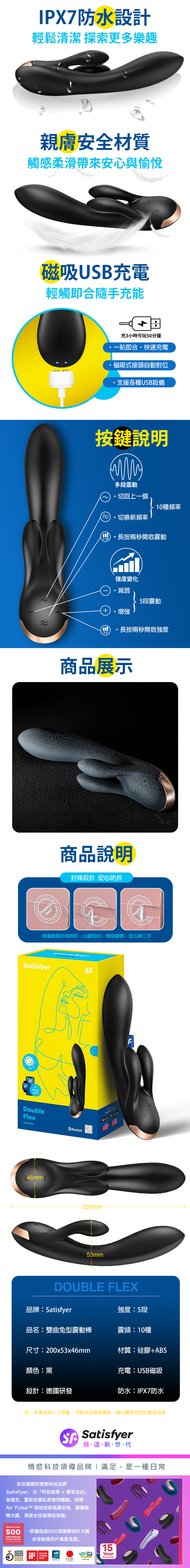 品名:Satisfyer|Double Flex|雙曲兔型震動按摩棒 黑
